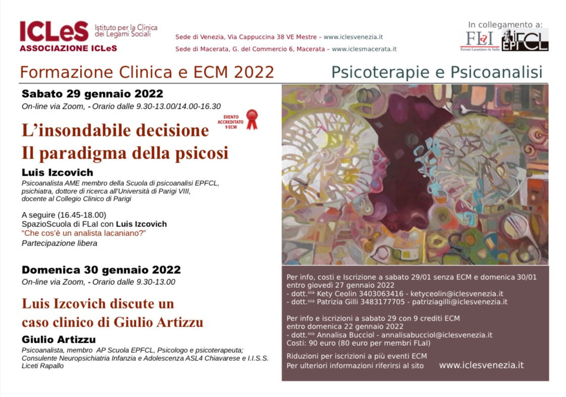Formazione con possibilità di crediti ECM ICLeS 2022 L’insondabile decisione: il paradigma della psicosi. l’interessante seminario di Luis Izcovich si terrà